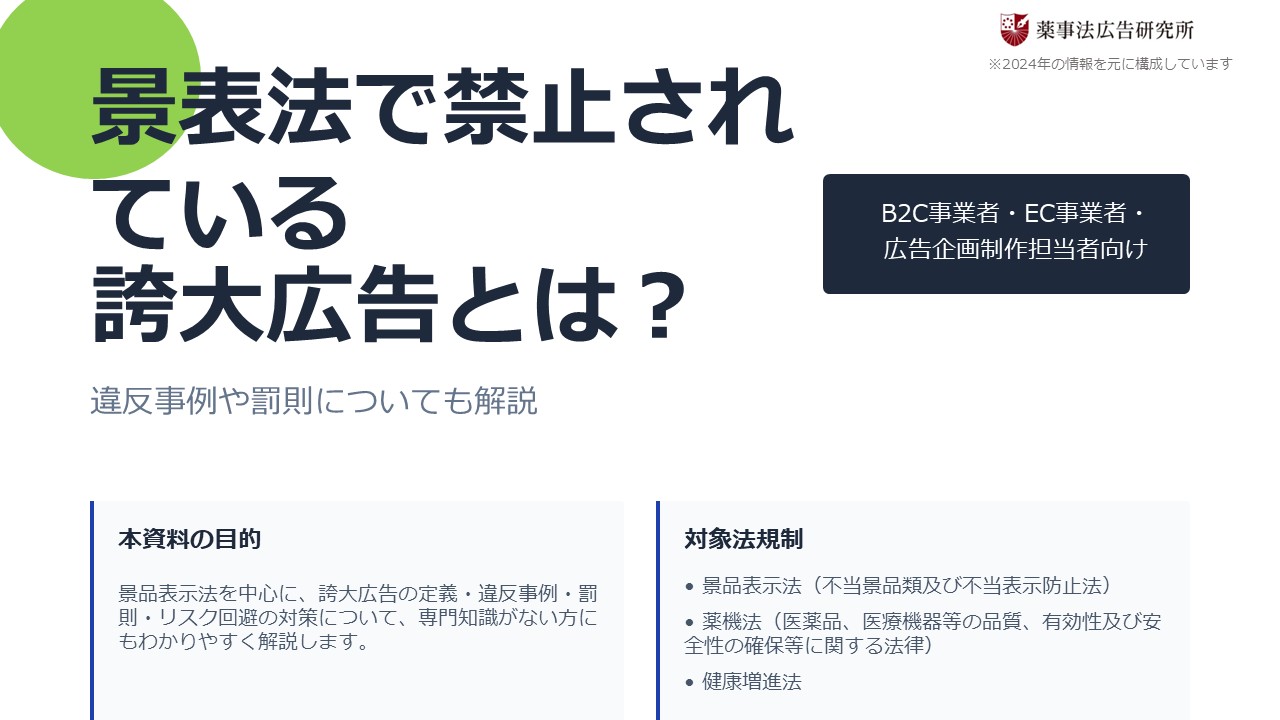 個別ダウンロード(無料)【法令順守×売れる広告表現】 私たちは、薬機法や景表法など広告に関連する法令を遵守しつつ、商品やサービスの魅力を最大限に引き出す広告表現をご提案します。法律をすり抜けるような表現ではなく、価値...