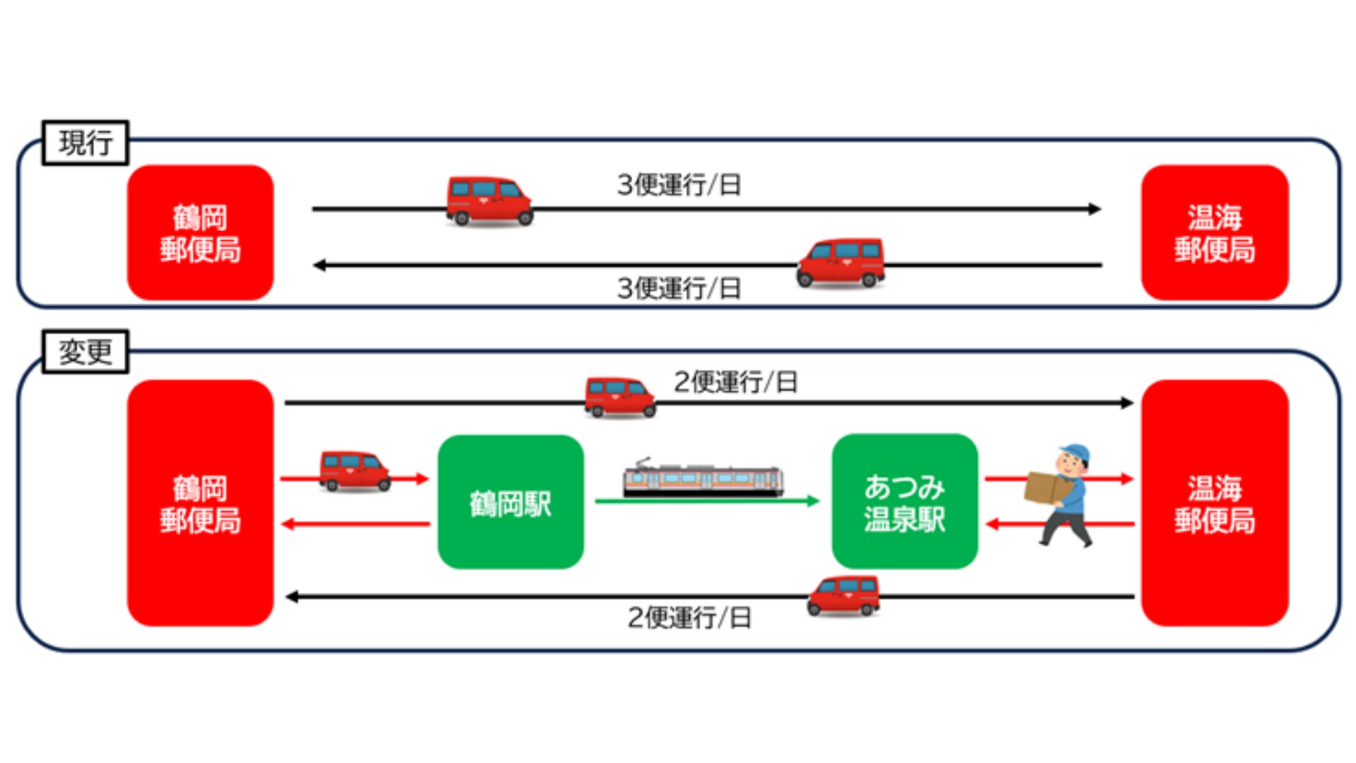 ...ビス「はこビュン」による郵便物やゆうパックの配送を羽越本線で開始すると発表した。鶴岡駅~あつみ温泉駅の区間で実施し、物流業界の人手不足問題や環境問題に対応する。 輸送のイメージ ▽関連記事 JR北海道フレッ...