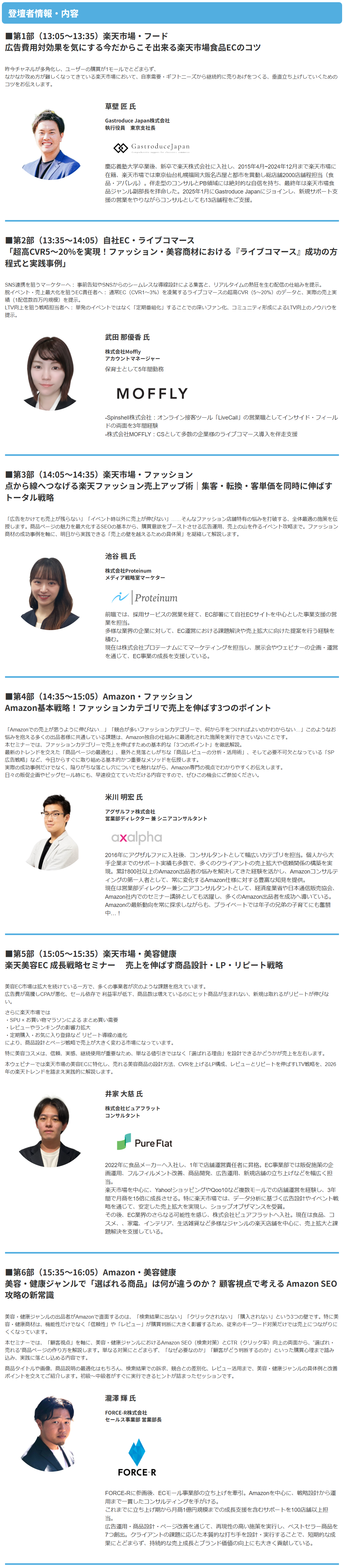 単なる「理論紹介」にとどまらず、「Amazon・楽天・自社EC」ならびに「ファッション・フード・美容健康」という商材・チャネルの多角的な視点から、他社事例を交えた具体的な成功シナリオを提示することで 、2026年の飛躍に向けた本質的な成長(脱イベントと売上最大化)を目指す内容とします。
