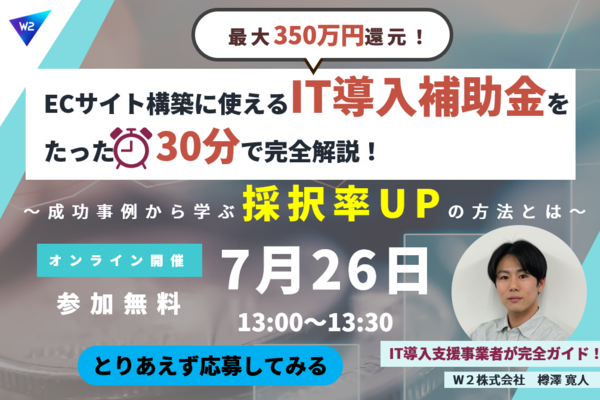 【7/26_WEB】ECサイト構築に使えるIT導入補助金をたった30分でIT導入支援事業者が完全解説 ~成功事例から学ぶ採択率UPの方法とは~