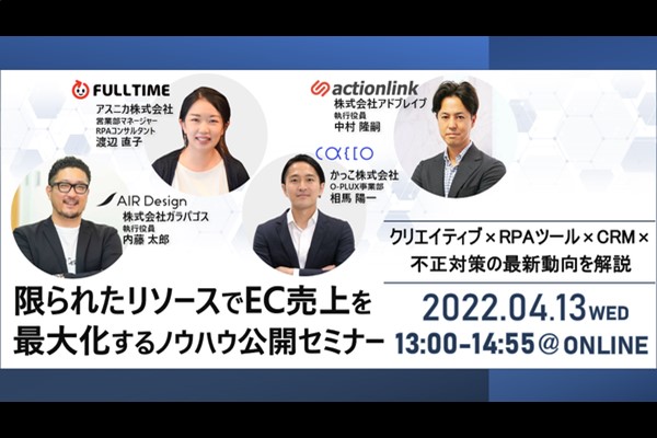 【4/13 WEB】限られたリソースでEC売上を最大化するノウハウ公開セミナー ~クリエイティブ×RPAツール×CRM×不正対策の最新動向を解説~