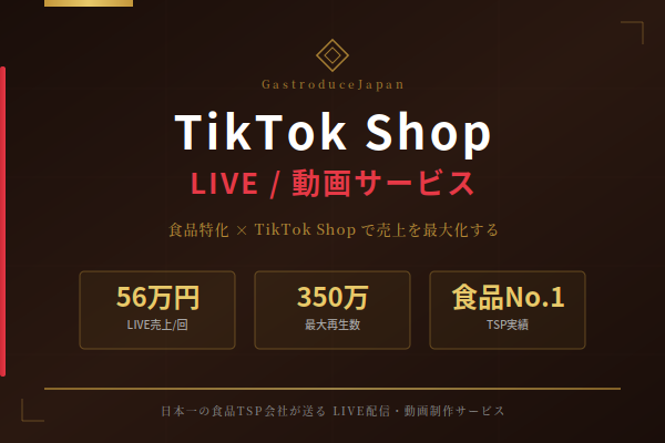 日本一の食品のTSP会社が送る、TikTok Shop専門のLIVE配信・ショート動画制作サービスです。食品特化×TikTok Shopで売上を最大化するための戦略設計から実行までをワンストップで提供します。【LIVE配信サ...