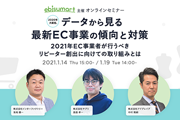 2021年1月14日(木)、1月19日(火)に「2020年大総括、データから見る最新EC事業の傾向と対策 ~2021年EC事業者が行うべきリピーター創出に向けての取り組みとは~」と題した無料Webセミナーを開催いたします...