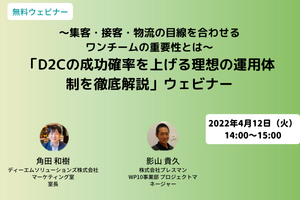 【4/12 WEB】 ~集客・接客・物流の目線を合わせるワンチームの重要性とは~ 「D2Cの成功確率を上げる理想の運用体制を徹底解説」ウェビナー