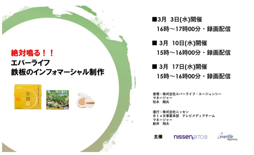 【3/3 WEB】無料ウェビナー「絶対鳴る!皇潤のエバーライフ 鉄板のインフォマーシャル制作方法、公開します!」※代理店の方参加不可