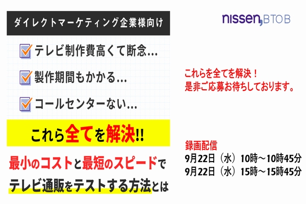【9/22 WEB】【代理店の方応募不可】無料ウェビナー『最小のコストでテレビ通販をテストする方法とは』