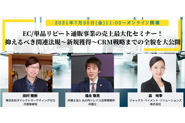 【7/30WEB】EC/単品リピート通販事業の売上最大化セミナー! 抑えるべき関連法規~新規獲得~CRM戦略までの全貌を大公開!