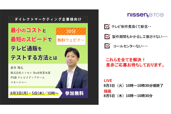 【8/3 WEB】【代理店の方応募不可】無料ウェビナー『最小のコストでテレビ通販をテストする方法とは』