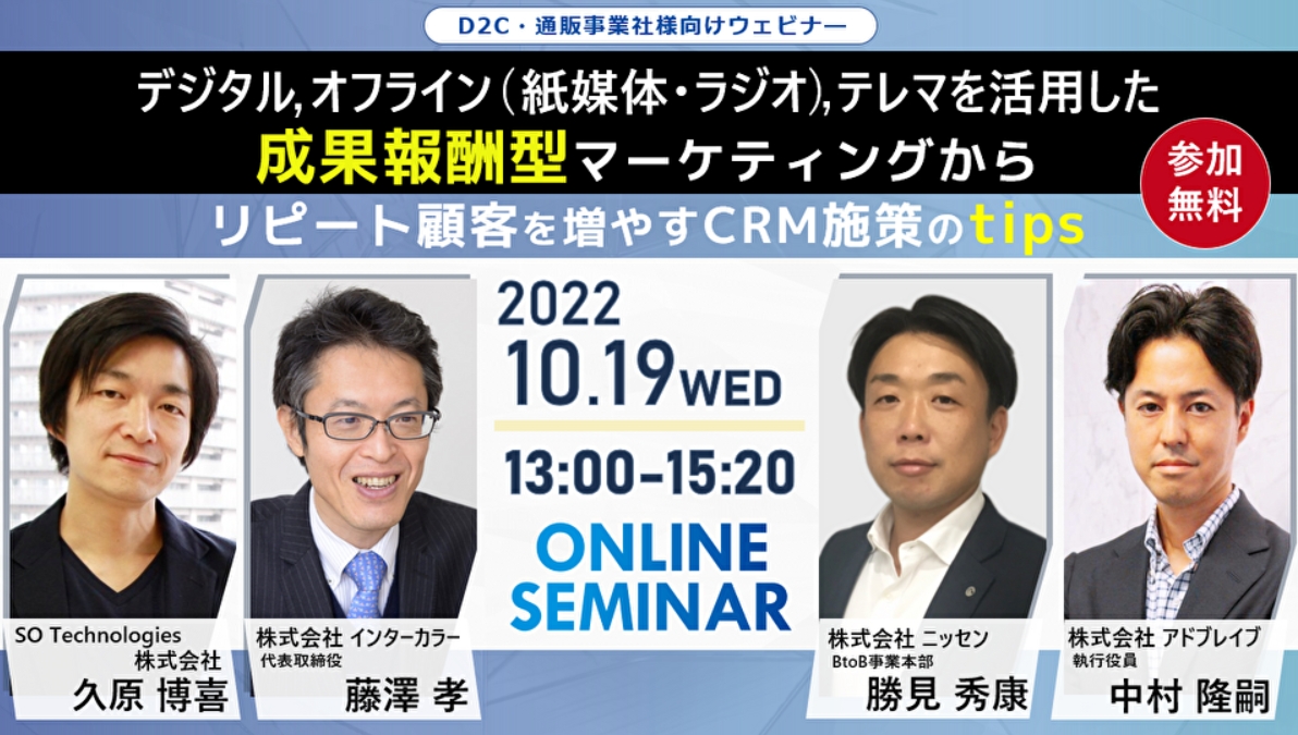 【10/19 WEB】デジタル、オフライン(紙媒体、ラジオ)、テレマを活用した成果報酬型マーケティングからリピート顧客を増やすCRM施策のtips