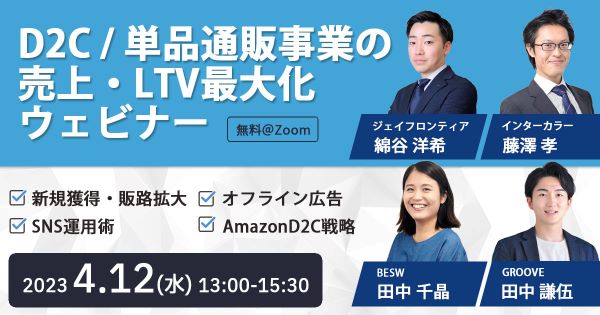 【4/12_WEB】D2C/単品通販事業の売上・LTV最大化ウェビナー~新規獲得・販路拡大×オフライン広告×SNS運用術×AmazonD2C戦略~