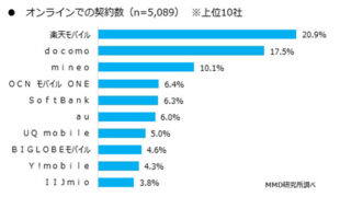 携帯電話の契約、オンラインでの契約数で楽天モバイルが1位に -