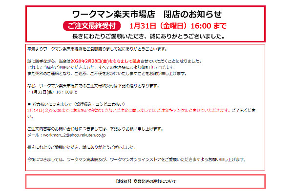 ワークマン、2月末で楽天市場店を閉店…注文は今月末まで -