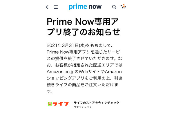 「Prime Now」専用アプリが終了、ライフの短時間... -