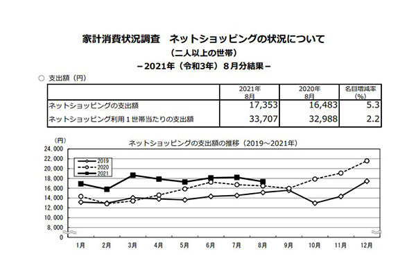 ネット通販利用世支出額、8月は5.3%増の1万7353円 -