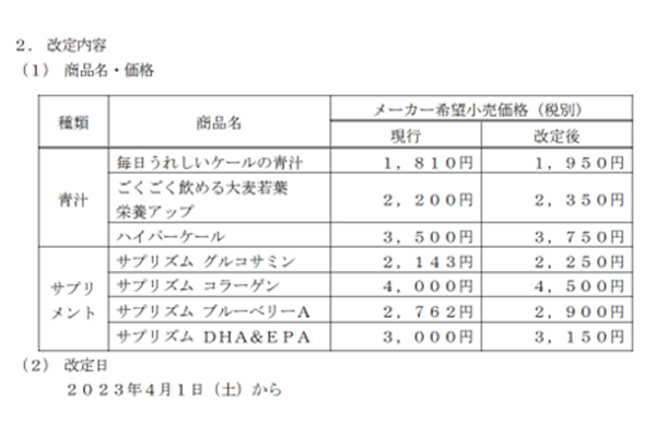 ヤクルト本社、4月から青汁・サプリの7商品で値上げ…物... -