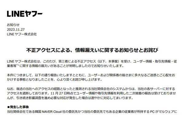 LINEヤフー、不正アクセスで約40万件の個人情報を漏えいか -