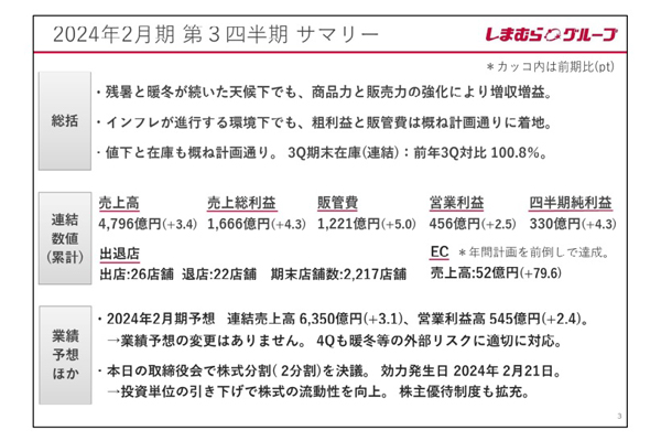 しまむら3Q 増収増益…EC事業は前倒しで年間計画を上回る -