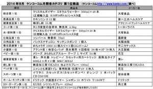 総合ランキングでは、日用品でトップの「パックスナチュロン キッチンスポンジ」、医薬品でトップの「ロキソニンS12錠」、ベビー用品でトップの「メリーズ さらさらエアスルー テープ Lサイズ54枚」(花王)(総合ランキング6位)などが、大幅に順位を上げた。また、医薬品では「薬用 養命酒1L」が急伸し、同カテゴリの5位に入った。健康食品では、1位に「梅ぼし純 24錠」(アサヒフードアンドヘルスケア)、2位にミヤリサン錠630錠(ミヤリサン製薬)、3位に「ヤクルト青汁のめぐり(7.5g×30袋)」(ヤクルトヘルスフーズ)が入った。