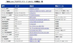 パソコン部門ではASUSU『EeeBook X205TA』、タブレットではソニー『Xperia Z4 Tablet Wi-Fi モデル SGP712JP』、調理家電ではパナソニック『W おどり炊き SR-SPX105』、ゲームソフトではレベルファイブの『妖怪ウォッチ 2 真打』が大賞を受賞した。今年は「コストパフォーマンスにこだわった製品」と「高くても納得の高機能製品」の二極化が見られた。