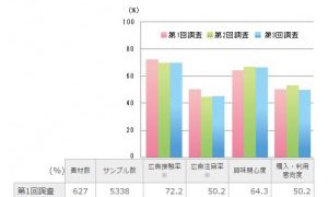 広告内容の事前認知度では、注目者ベースでの「広告内容事前認知度(よく+ある程度知っていた)」の全素材平均は59.8%となった。事前認知度が80%を超えた214素材では、「広告商品理解度」「興味関心度」「購入・利用意向度」がいずれも平均を上回った。