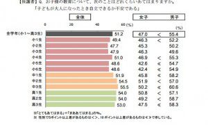 東京大学社会科学研究所と(株)ベネッセホールディングスが14日公表した「子どもの生活と学びに関する親子調査 2015」によると、5割の保護者が「将来、子どもが自立できるか不安」と回答したことがわかった。