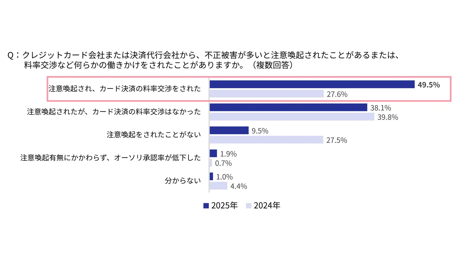 かっこが12月24日発表した「EC事業者実態調査2025」から、本人認証「3-Dセキュア」の導入義務化後も不正被害が減らず、クレジットカードの不正利用による被害が多いことを理由に、カード会社から決済手数料の値上げ交渉を受けた事業者が、前年の約2倍に急増していることがわかった。