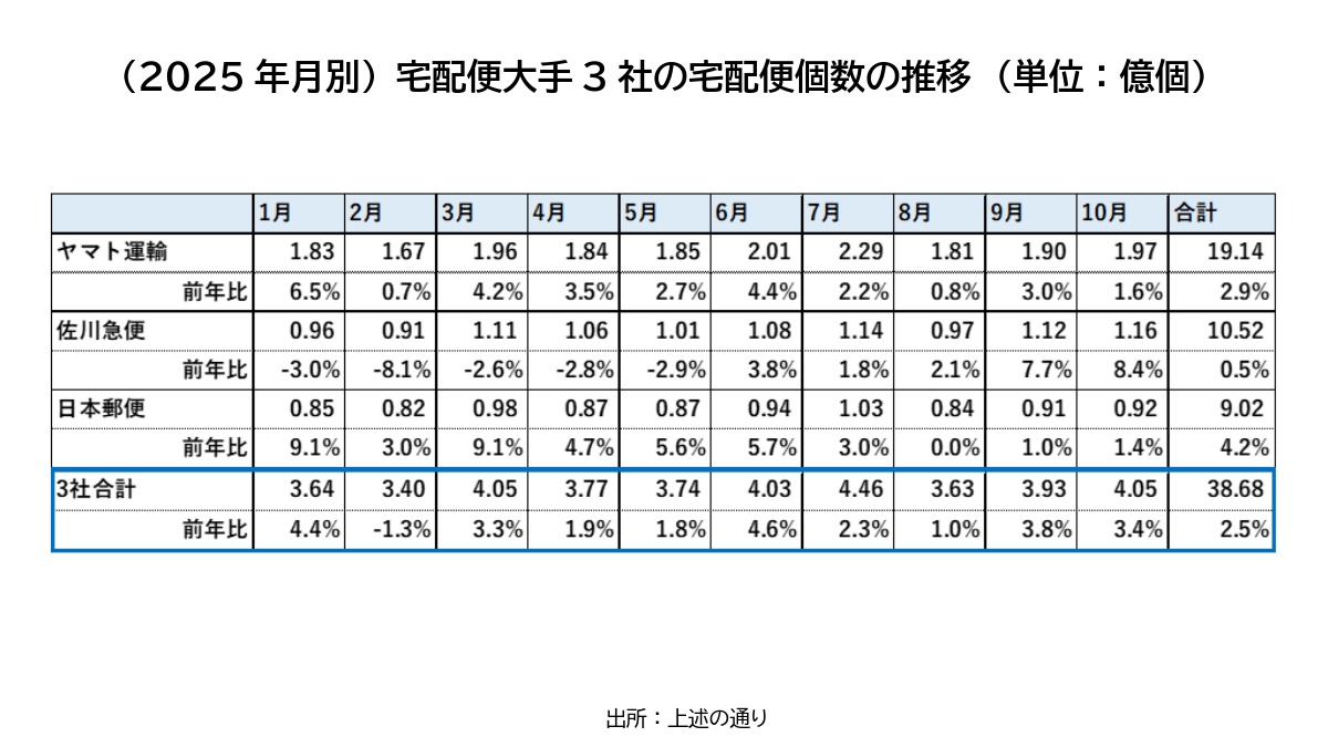 宅配便大手3社合計の10月までの宅配便個数は38.68億個となりました。前年比で2.5%の伸びです。個社毎に見ると、ヤマト運輸は+2.9%、佐川急便は+0.5%、日本郵便は+4.2%となっており、伸び率では日本郵便の値が高い結果になりました。