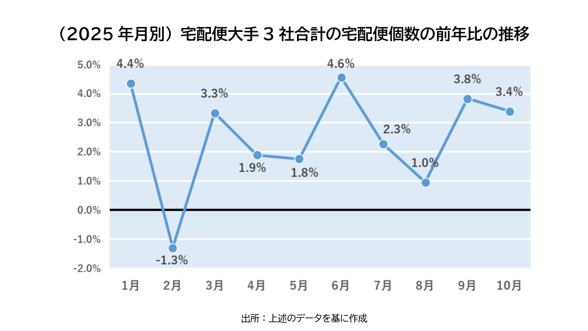 話を戻しましょう。2025年の10月までの宅配便大手3社の宅配便個数が、前年比で+2.5%と述べました。上述の点を踏まえれば、当然このなかには“非”ECが約半数含まれます。とした場合、純粋にECでの宅配便個数の伸び率は、単純計算ですが以下の通りです。
