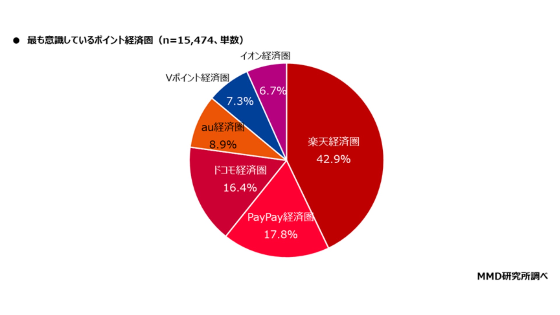 ポイント経済圏を意識している約1万5000人を対象に、最も意識しているポイント経済圏を聞いたところ、「楽天経済圏」が42.9%を占め、最も多かった。次いで「PayPay経済圏」(17.8%)、「ドコモ経済圏」(16.4%)、「au経済圏」(8.9%)、「Vポイント経済圏」(7.3%)、「イオン経済圏」(6.7%)の順となった。