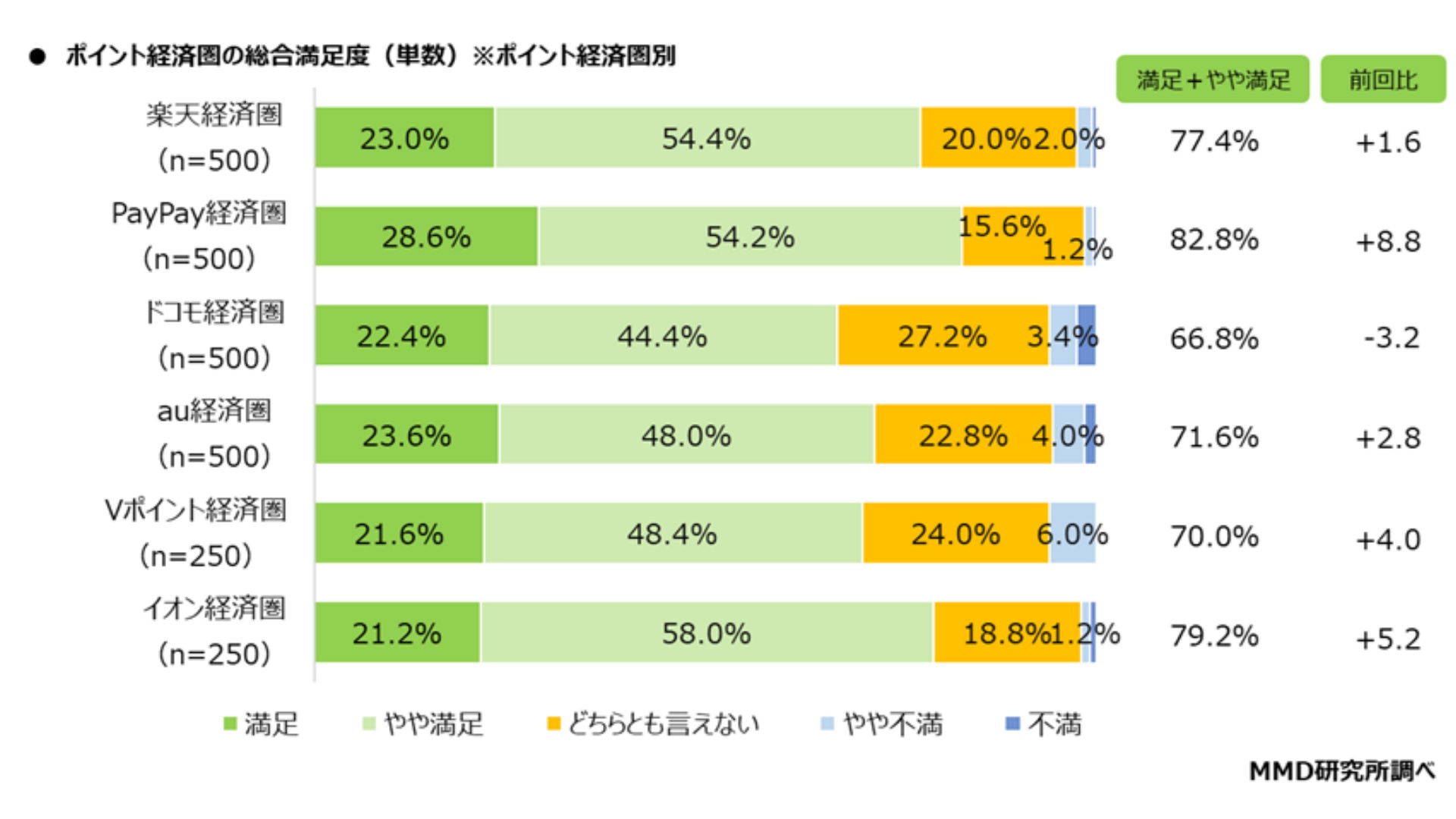 メインで利用しているポイント経済圏の総合満足度については、「満足」「やや満足」を合わせた割合は「PayPay経済圏」が最も高く、これに「イオン経済圏」が続いた。昨年7月の調査から、満足している割合が最も伸びたのは「PayPay経済圏」だった。