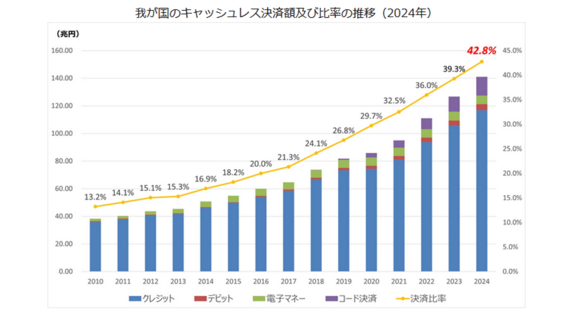 政府はキャッシュレス決済比率を2025年までに40%程度へ、将来的には80%を目指す目標を掲げる。経済産業省によれば24年のキャッシュレス決済比率は42.8%と目標を達成し、中でもクレジットカードとコード決済の伸びが目立つ。