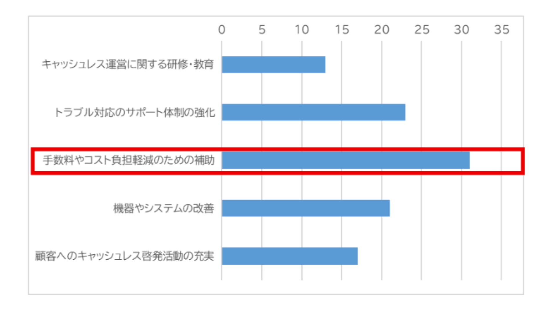店舗側が行政に期待するサポートについては、キャッシュレスにかかる手数料やコストの補助を求める回答が突出していることが分かった。次いでトラブル対応のサポート体制強化やシステムの改善を求める回答が多く、運営の安定化が求められている。