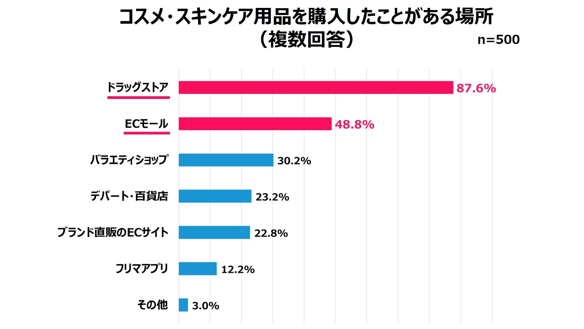 全国の20~30代女性の500人を対象とした調査の結果によると、コスメ・スキンケア用品を購入する場所(複数回答)は、「ドラッグストア」(87.6%)、「ECモール」(48.8%)、「バラエティショップ」(30.2%)、「デパート・百貨店」(23.2%)、「ブランド直販のECサイト」(22.8%)の順となった。