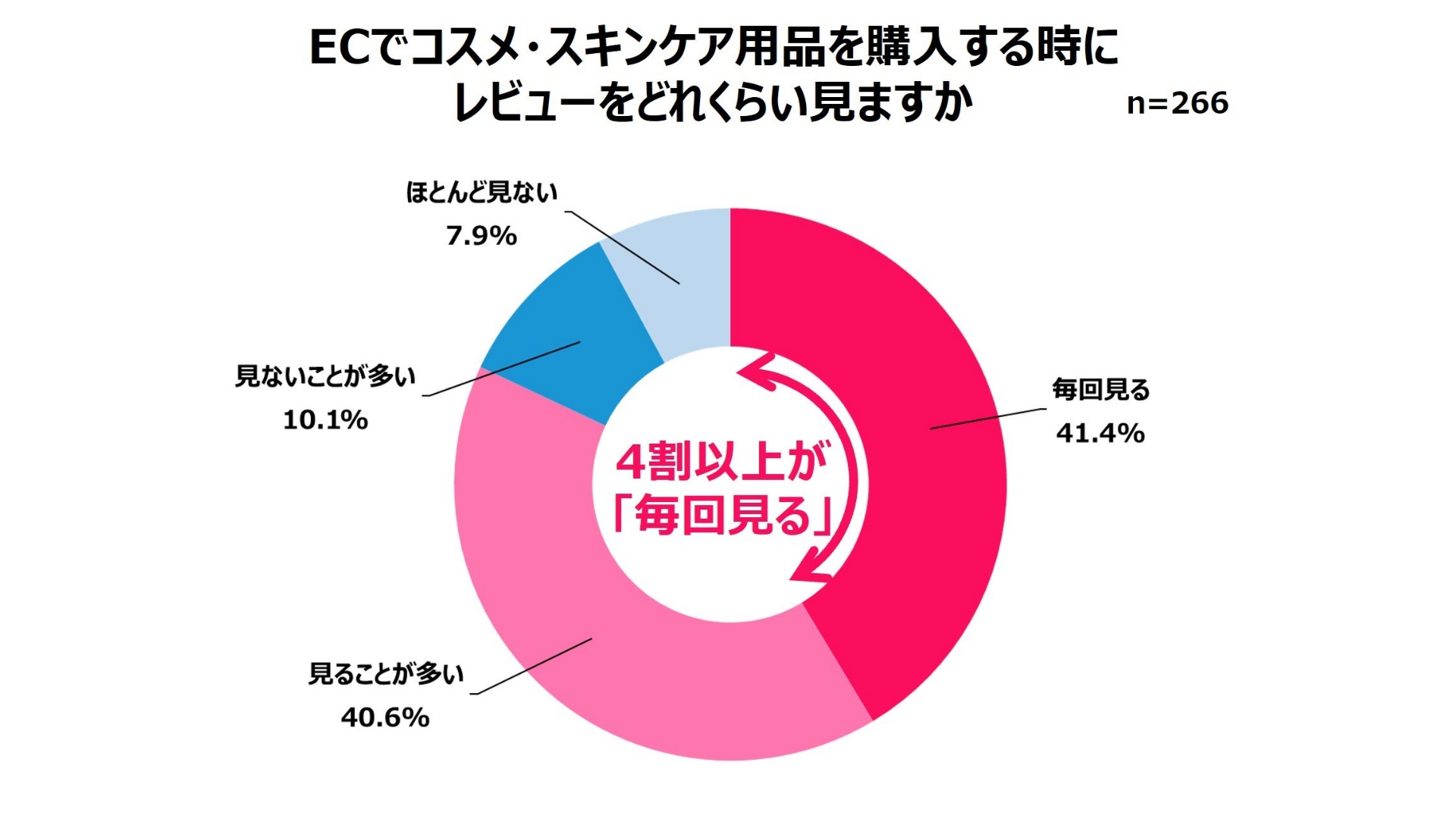 ECのレビューについては、「毎回見る」が41.4%を占めた。「見ることが多い」も合わせると、全体の8割以上がレビューを重視していることがわかった。