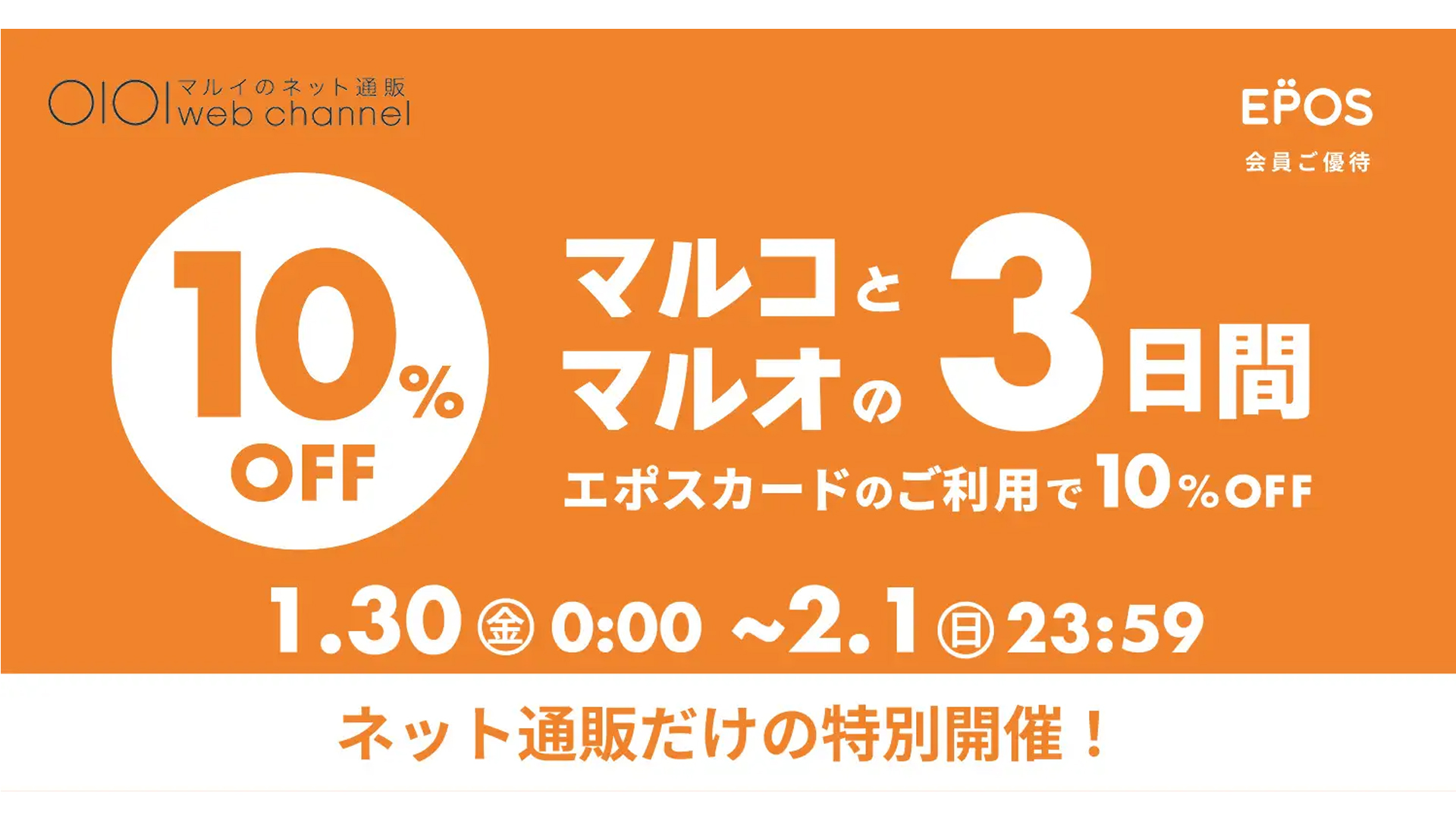 丸井は1月30日~2月1日の期間、インターネット通販「マルイウェブチャネル」限定で、エポスカード会員優待キャンペーン「マルコとマルオの3日間」を開催する。エポスカードのクレジット払いで支払うと、10%オフで買い物ができる。