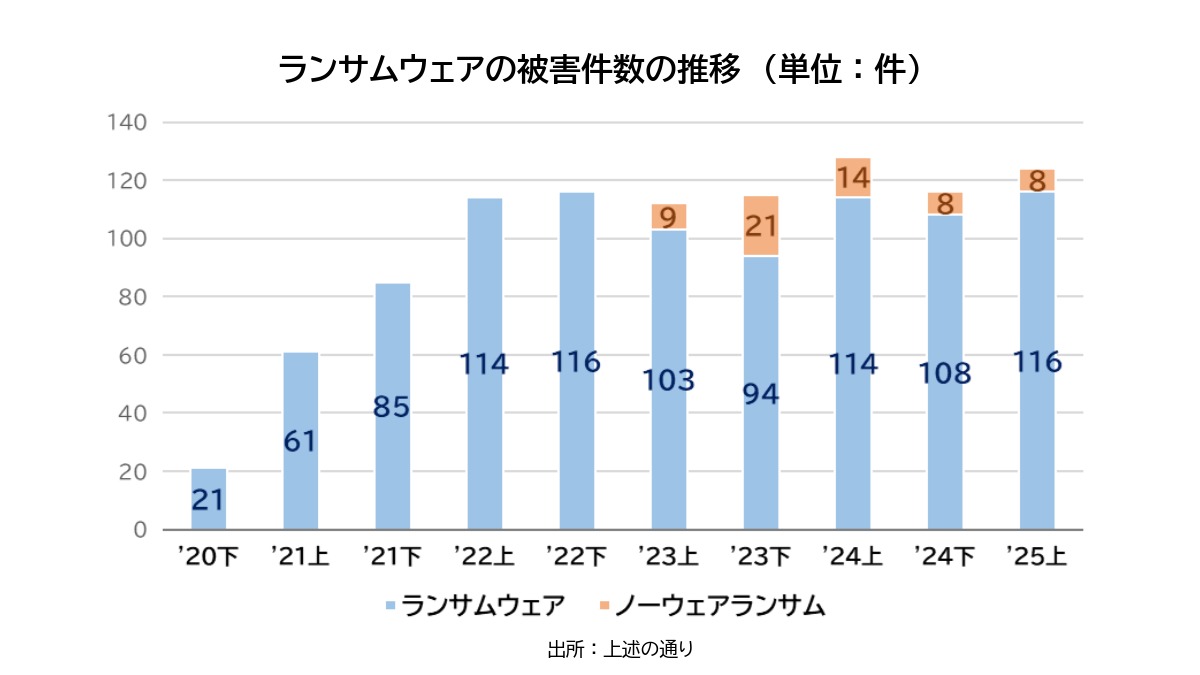 警視庁発表のデータによると、2025年上半期のランサムウェアの被害件数は116件、ノーウェアランサムの被害件数は8件でした。ノーウェアランサムとは、データを盗んだ上で暗号化は行わずにそのまま公開するとして脅迫し、身代金を要求するランサムウェアの攻撃です。