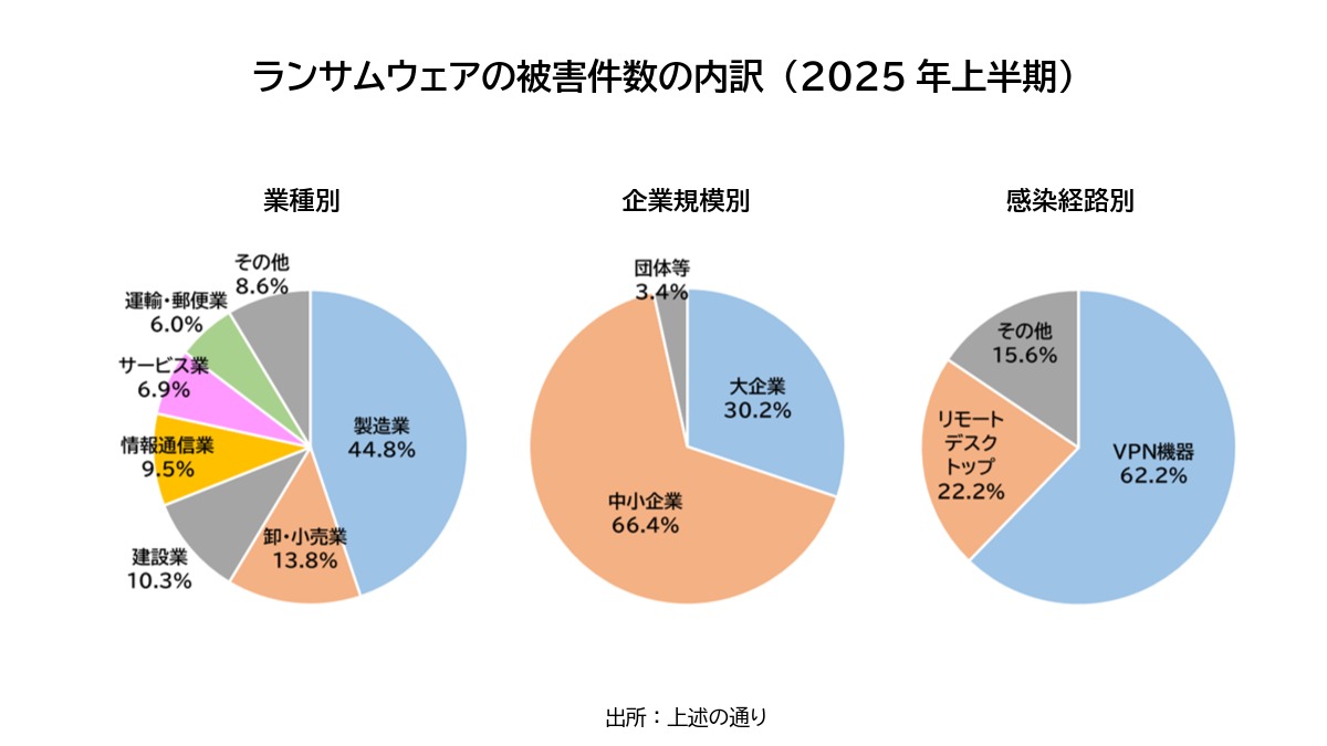 ランサムウェアの被害件数について、その解像度を上げてみましょう。2025年上半期の状況をもとにした業種別での被害件数の比率は、製造業が44.8%と最も多く、次いで卸・小売業13.8%、建設業10.3%、情報通信業9.5%となっています。