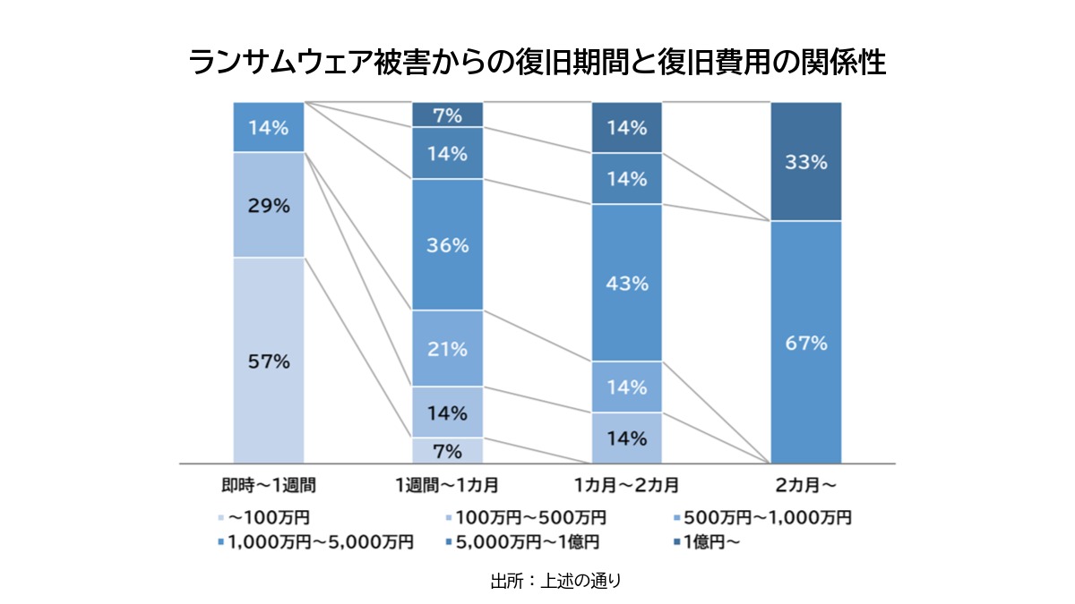 警察庁は、ランサムウェア被害からの復旧期間と復旧費用の関係性についてもデータを公開しています。復旧期間が即時~1週間と短いケースでは、比較的費用の額は小さいようです。反対に復旧期間が2カ月以上にも及ぶケースでは、費用が1億円以上となるケースが33%を占めています。