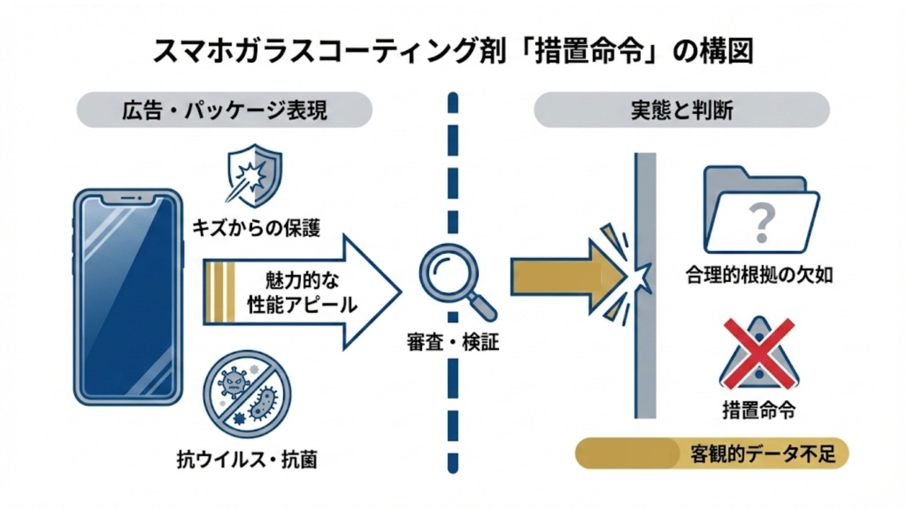 今回、業界に大きな衝撃を与えたのは、大手販売会社が提供していたスマホ用ガラスコーティング剤に対する措置命令です。この事例では、パッケージ等に記載された「キズからの保護」や「抗ウイルス・抗菌」といった性能表現の「根拠」が、合理的ではないと判断されました。