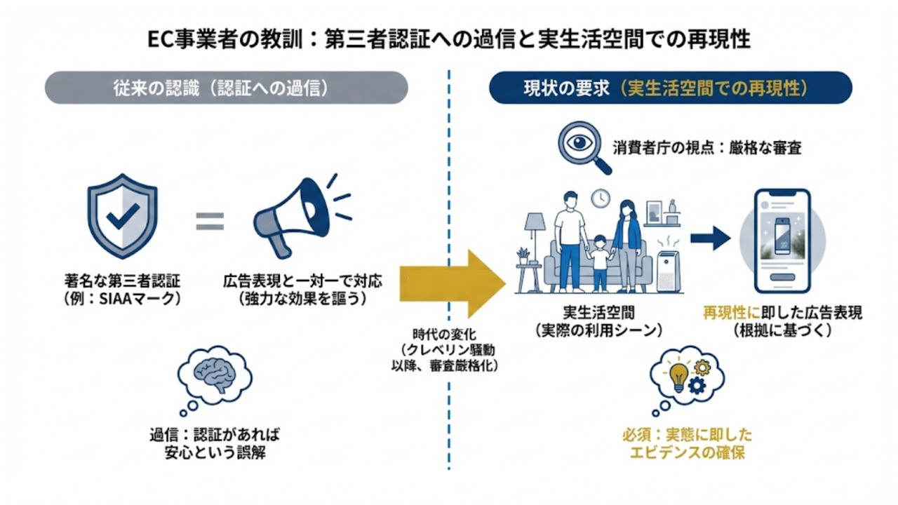 特にEC事業者が教訓とすべきは、第三者による「認証」への過信です。本事例では抗菌性能の証として「SIAA認証マーク」を掲げていたものの、当局は「認証は試験方法に基づく合格を示すもので、実際の使用環境での効果を保証しない」と一蹴しました。