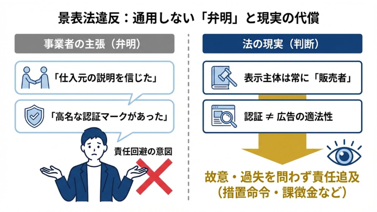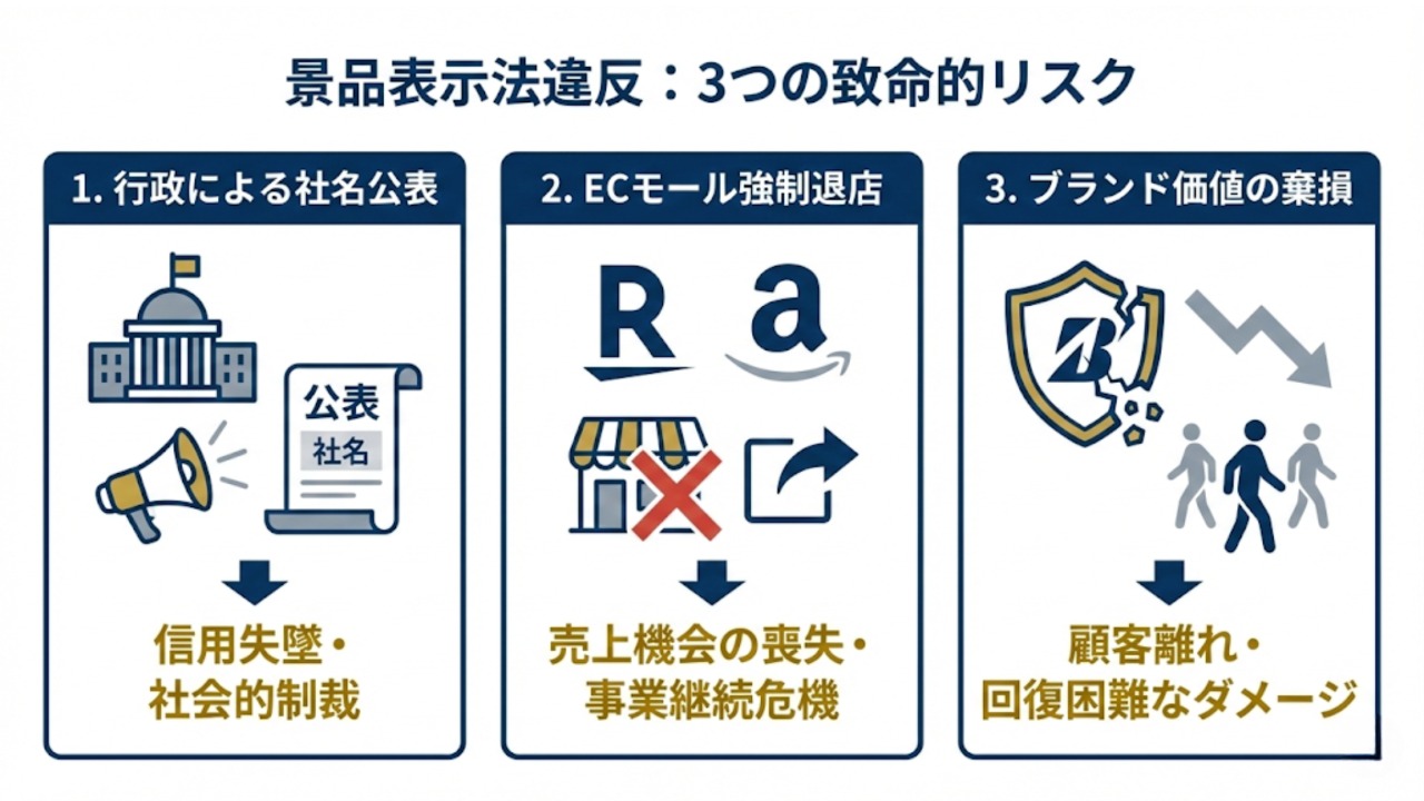 景品表示法に抵触した際、EC事業者が負う代償は「修正」や「謝罪」だけでは済みません。特に「仕入元の説明を信じた」「高名な認証マークがあった」という弁明は、法執行の場では通用しないのが現実です。ここでは、不当な表示が認定された場合に事業者が直面する、多層的なリスクを整理します。