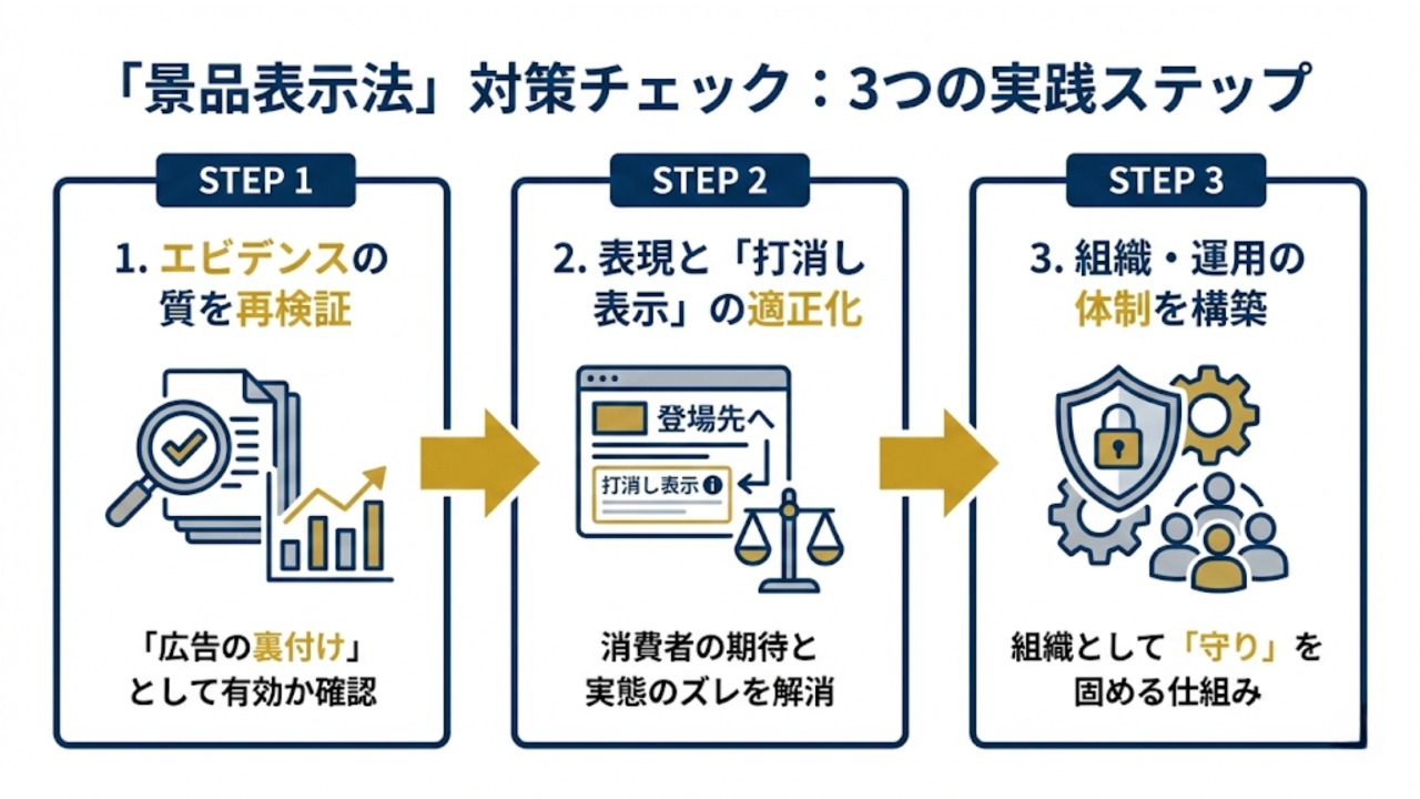 不当な表示を未然に防ぐには、現場レベルでの点検体制が不可欠です。今回の事例で露呈したのは、たとえ「認証」があっても、その内容が広告表現と乖離していれば法的根拠として認められないという厳しい現実でした。明日から自社サイトを点検するための「景品表示法」対策チェックリストを、三つの観点で提示します。