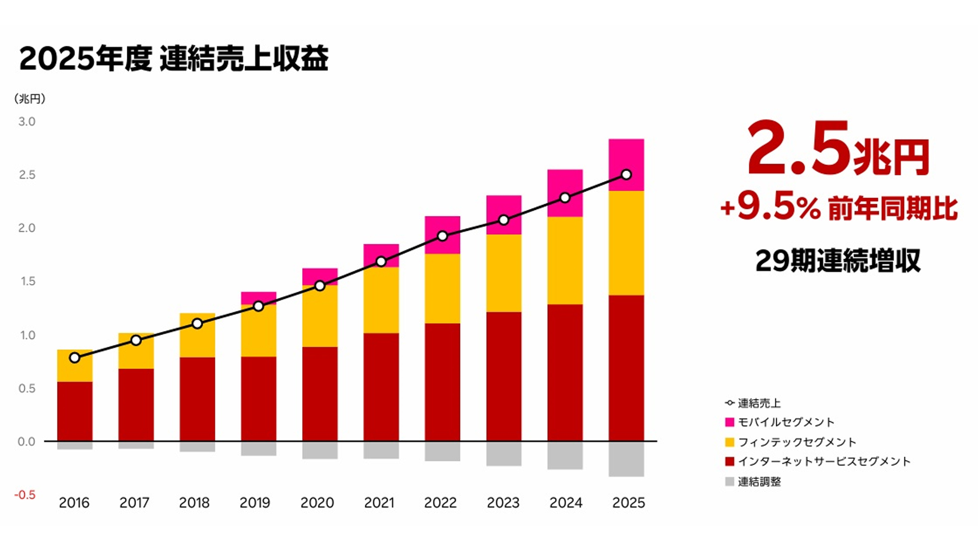 楽天グループが2月12日発表した2025年12月期の連結決算は、売上収益が前期比9.5%増の2兆4965億円、営業利益が同72.9%減の143億円、当期損益が1778億円の赤字となった。楽天モバイルとのシナジー効果もあり、ECモール「楽天市場」などが牽引した結果、インターネットサービスの売上収益は同6.8%増の1兆3696億円を計上した。