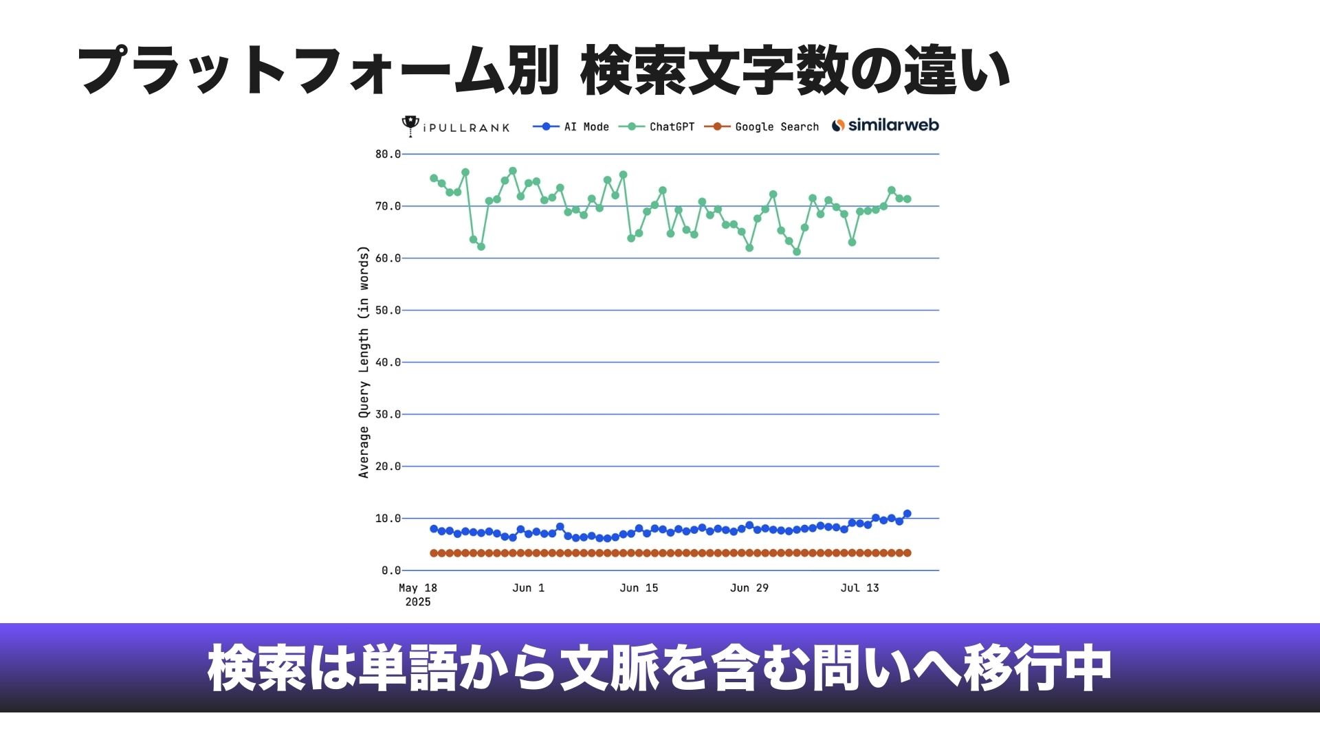 AI検索が成熟するにつれ、キーワードよりも具体性が重視されるようになります。現在のユーザーは、Google検索より多くの言葉を使いながらも、ChatGPTほど長い入力は行っていませんが、行動変化はすでに始まっています。