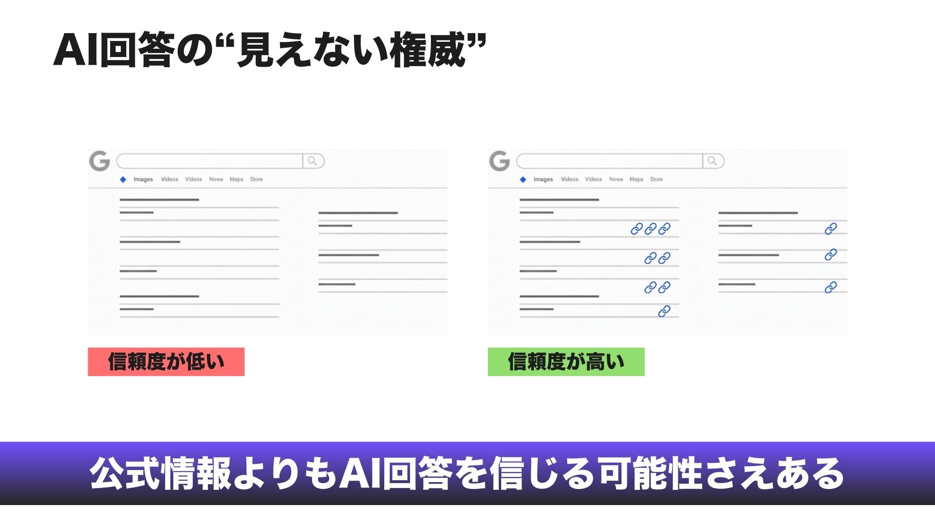 ユーザーはAIに懐疑的でありながら、リンクや引用が存在するだけで、たとえそれが壊れたリンクや幻覚(Hallucination)であっても、回答への信頼度を大きく高めます。