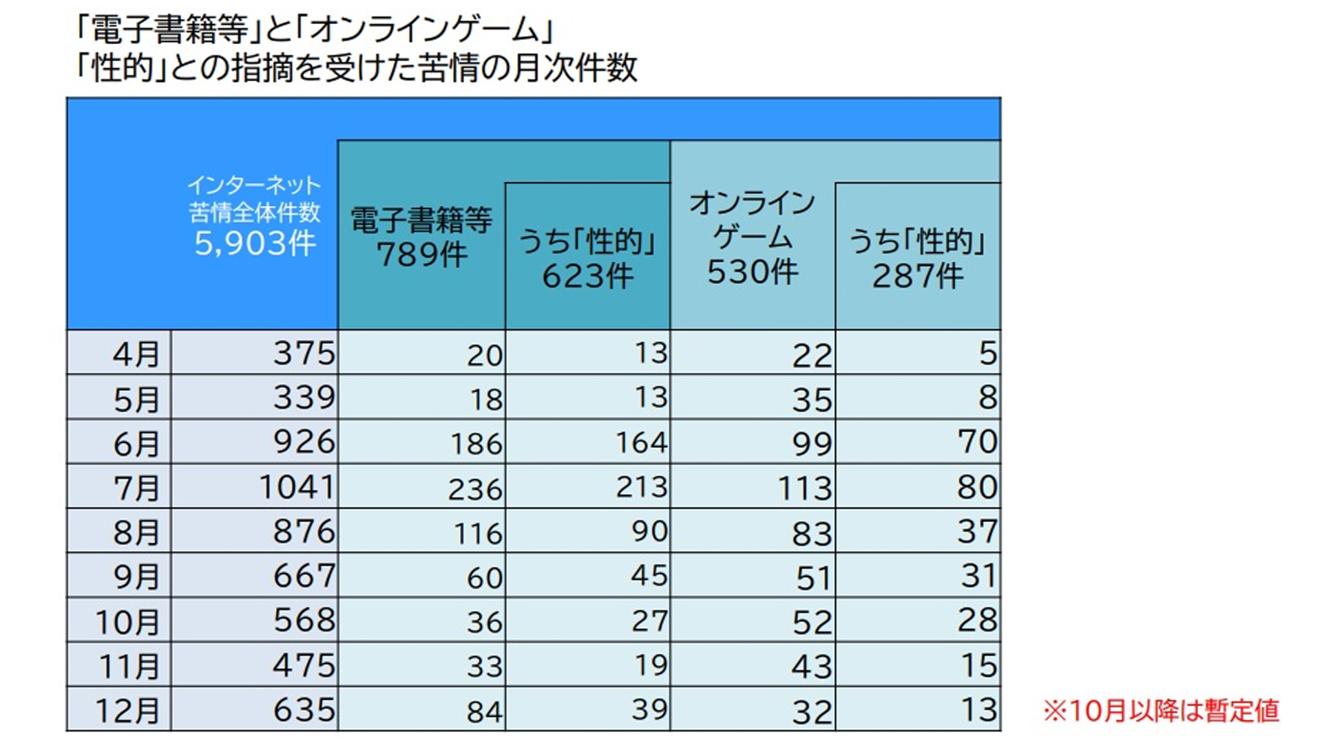 「性的な広告」への苦情は、特に6月~8月に急増し、9月以降も高い水準で推移した。月別の動向を見ると、「電子書籍・ビデオ・音楽配信」は4月が13件だったが、6月に164件に急増し、7月には213件に上った。「オンラインゲーム」は4月が5件だったが、6月に70件、7月に80件に急増した。