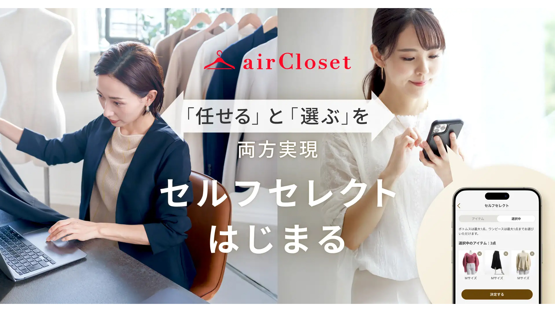 エアークローゼットは3月11日、月額制ファッションレンタルサービス「airCloset」に、ユーザーが商品を選択できる機能「セルフセレクト」を追加すると発表した。スタイリストによる提案を軸としつつ、ニーズに合わせてユーザー自身が選べるようにする。