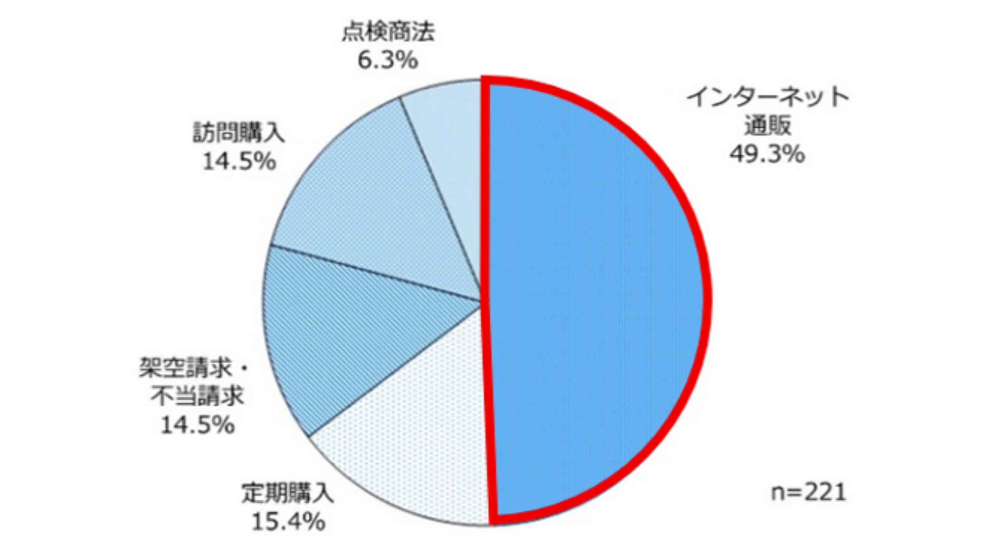 「被害に遭ったことがある」と回答した人に、どのような販売方法・商法で被害に遭ったのかを聞いたところ、「インターネット通販」が49.3%に上り、最も多かった。次いで「定期購入」が15.4%、「架空請求・不当請求」と「訪問購入」がそれぞれ14.5%、「点検商法」が6.3%で続いた。