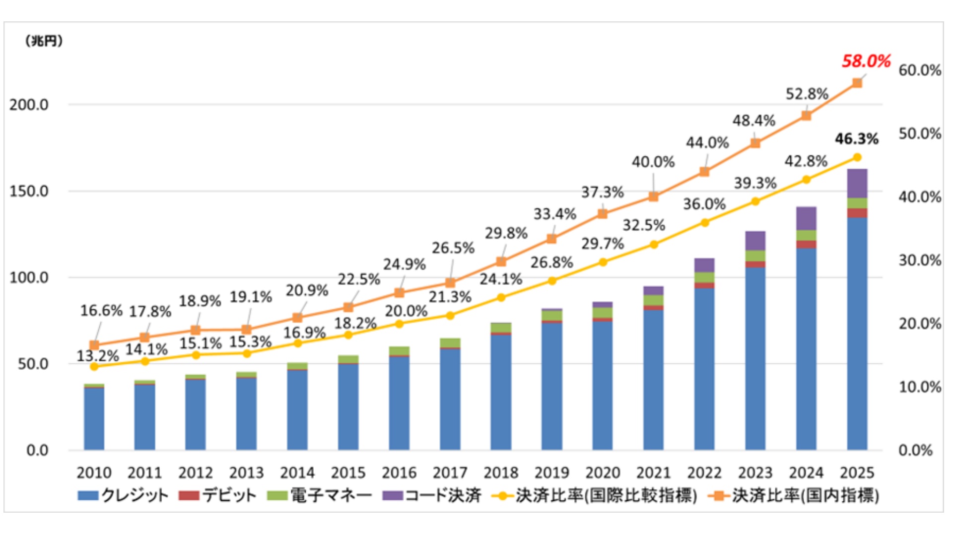 2025年のキャッシュレス決済比率は58.0%で、決済額は162.7兆円となった。内訳はクレジットカードが82.7%・134.6兆円、デビットカードが3.4%・5.5兆円、電子マネーが3.7%・6.0兆円、コード決済が10.2%・16.6兆円だった。