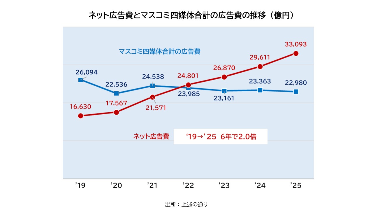 2025年のネット広告費は3.3兆円とマスコミ四媒体広告費の1.5倍